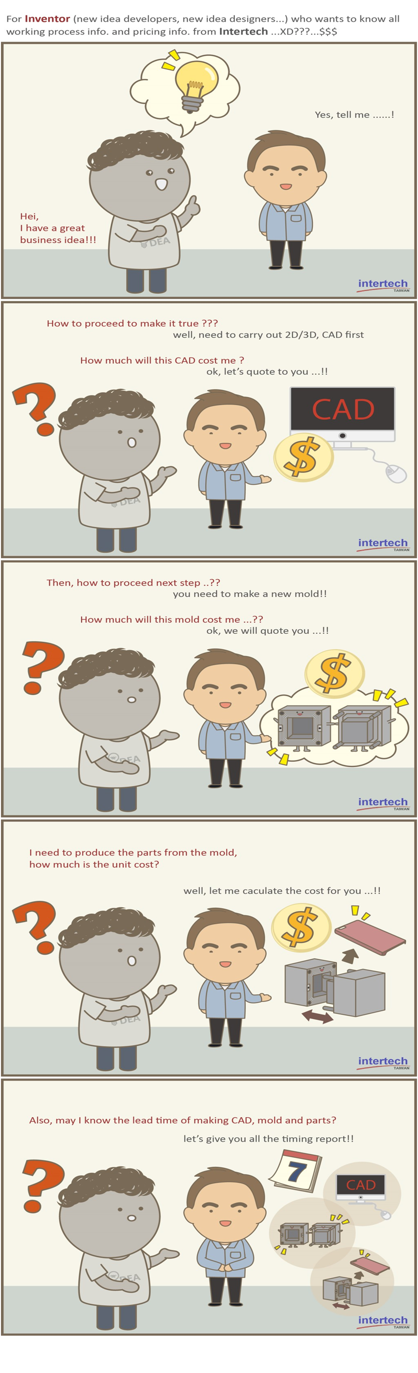 These cartoons are quite easy and fast to be understood. Our four major customers: industrial designer, investor, plant manager and inventor, can easily find the best way to get in touch with Intertech by reading these cartoon to find the best supply solution from Intertech.