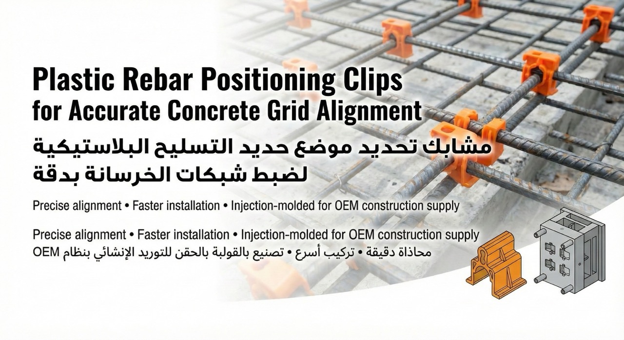مشابك تحديد موضع حديد التسليح البلاستيكية هي مكونات بلاستيكية مصنّعة بالقولبة بالحقن، تُستخدم لتثبيت قضبان التسليح المتقاطعة في موضع ثابت ومتكرر. بعد التركيب، تعمل المشبك على تثبيت الشبكة ومنع تحركها أثناء صب الخرسانة والاهتزاز.