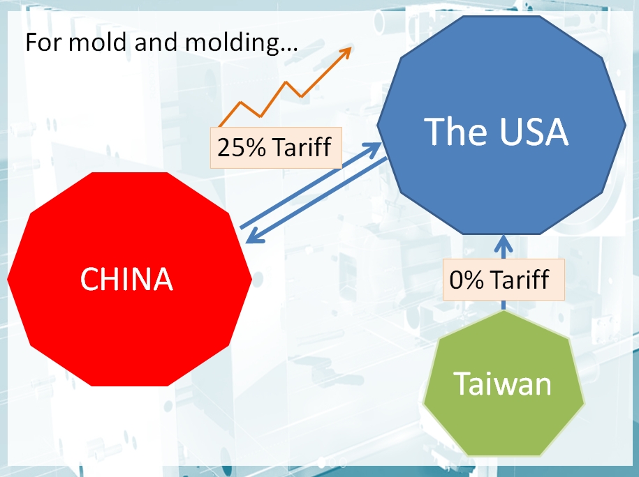 Since the very beginning of September, 25% tariff has put on imported products from China due to China–United States trade war. More and more US company started to consider if they need to find a new partner or not. However, it's a good chance for Taiwan to introduce our high-quality goods to American customers. The reason is simple – the tariff for mold and molding is zero between Taiwan and America.