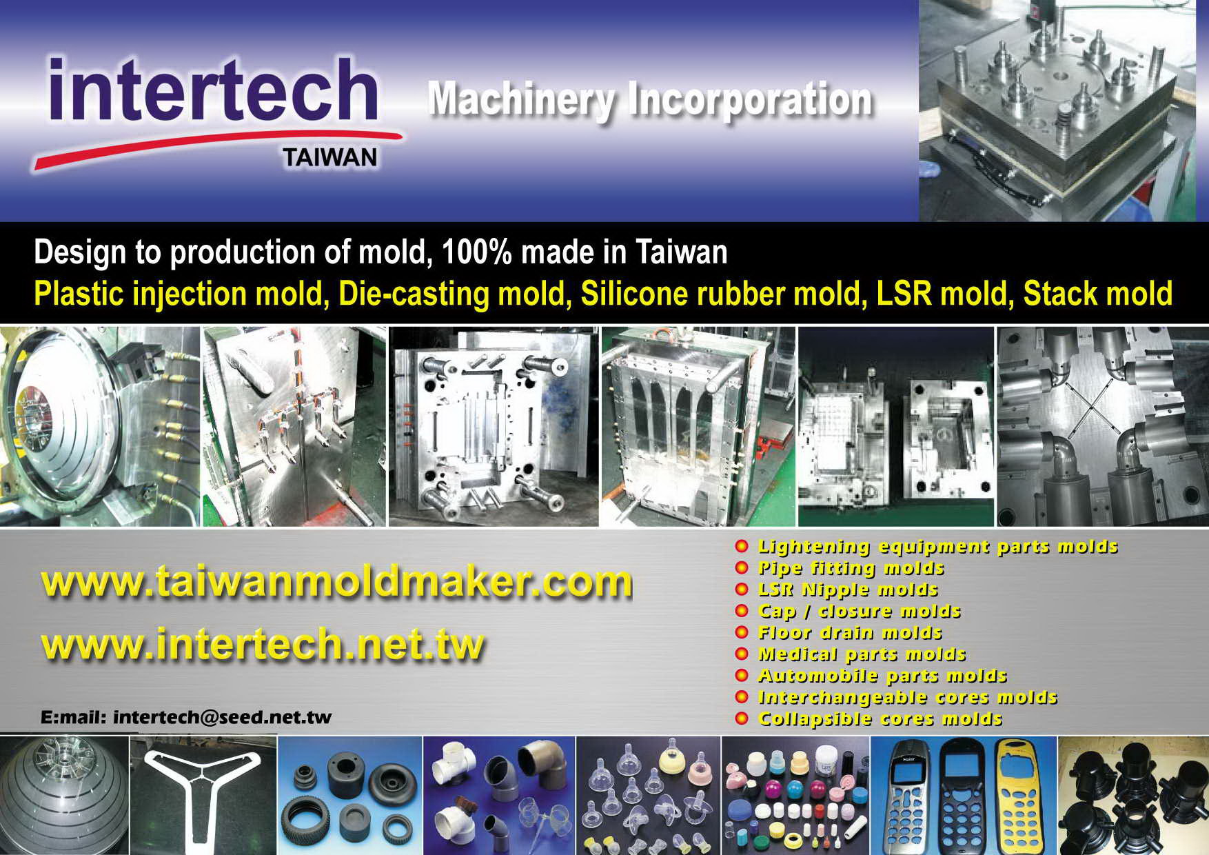 Intertech is one of the giants in mold industry in Taiwan. We have more than 30 years experience for making customized molds for different kinds of plastic, silicone, rubber, and metal stamping. We only apply Japan and German steel to our mold. The products will be 100% made in Taiwan.For plastic mold, we had make panel, cover, lid, pipe, device case……, and so on.