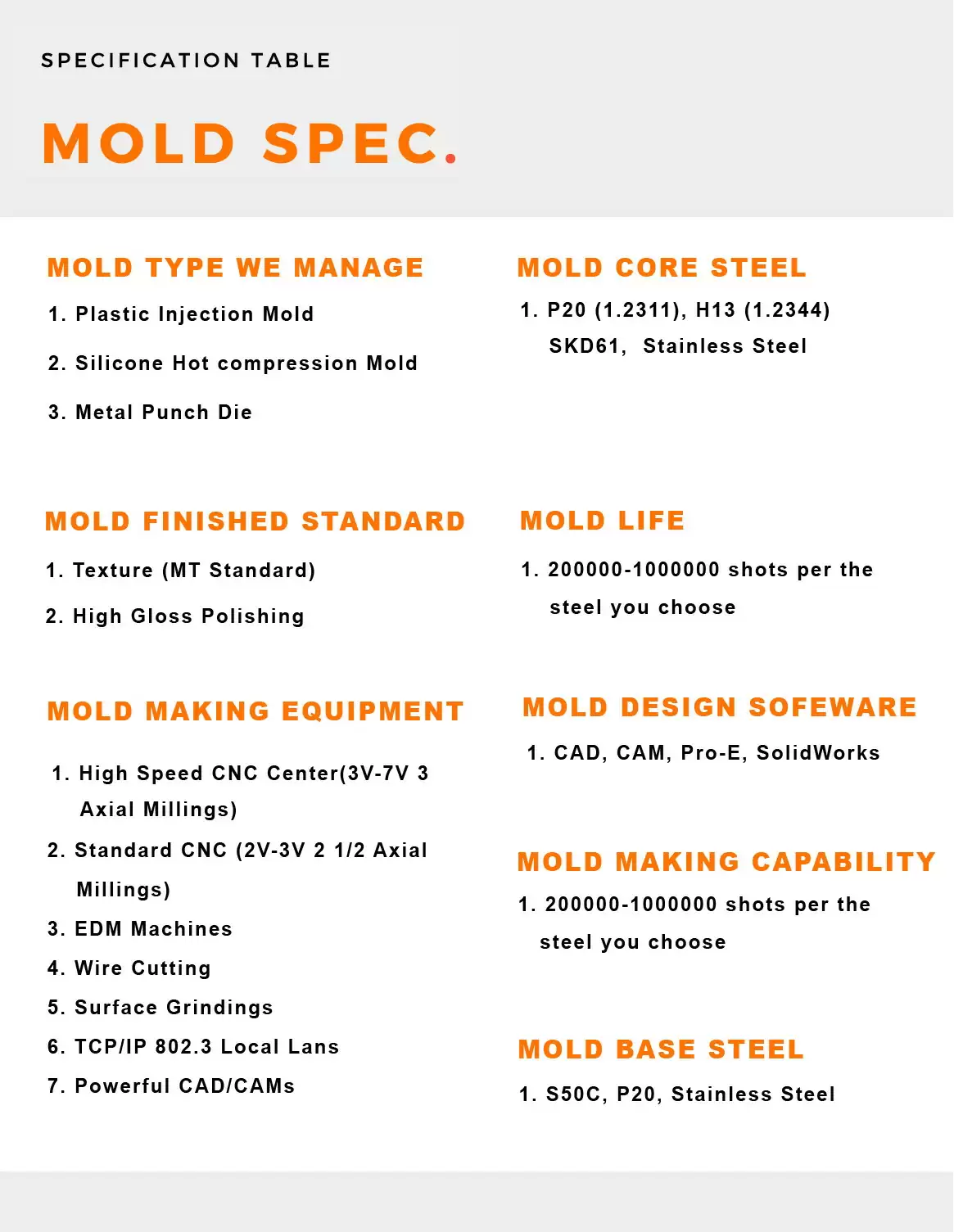 Injection Mould, Plastic Mold, Overmould, 2k mould, Die-Casting Mould, Thermoset Mold, Stack Mold, Interchangeable Mold, Collapsible Core Mold, Die Sets, Compression Mold, Cold runner system LSR Mold,…etc. |