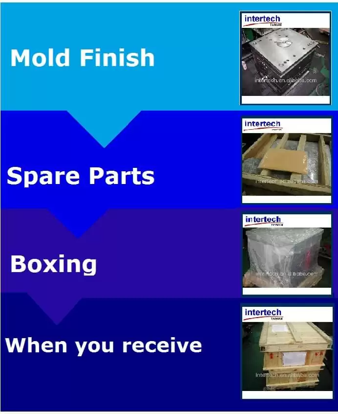 Intertech Machinery is good at manufacturing plastic mold components used in industrial and packaging applications. Per customer’s demand, we will discuss the raw material required, the color master batch requires, mold making size required, molding machine size required, cycle time estimation, production time calculation report…etc with customers. After that, parts design service, mold engineering service, mass production arrangement, post assembly service or post machining service are also provided.