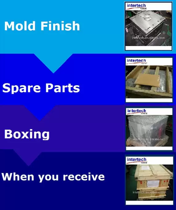Intertech Machinery is good at manufacturing plastic mold components used in industrial and packaging applications. Per customer’s demand, we will discuss the raw material required, the color master batch requires, mold making size required, molding machine size required, cycle time estimation, production time calculation report…etc with customers. After that, parts design service, mold engineering service, mass production arrangement, post assembly service or post machining service are also provided.