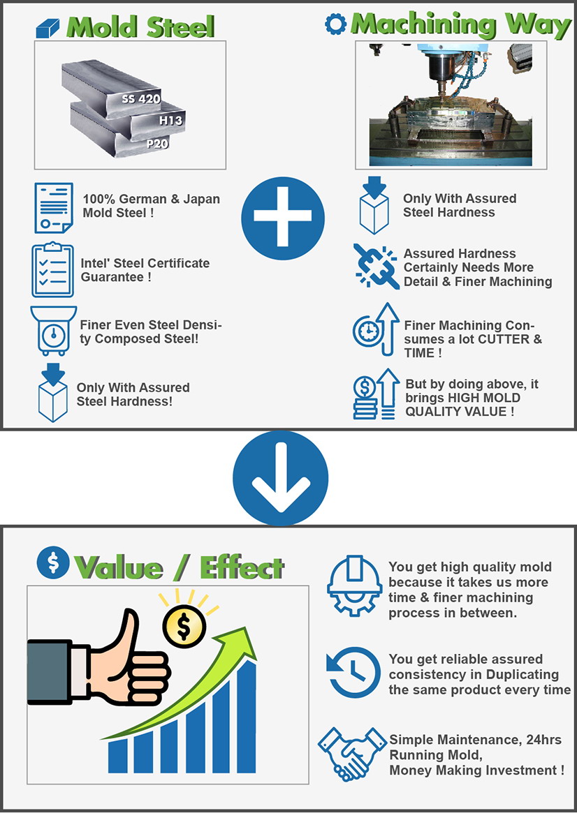 Good quality (steady, averaged even in every section of the entire steel) requires certain machining process hours to ensure the quality level. Comparing with those lousy low quality and cheap price steels, all Intertech’s imports German and Japan mold steels will take longer time in machining house (because its steady, averaged even in every section of the steel) and consumed more cutters during the machining process, but this will bring you a fruitful outcome for good steel performance, quality and lifetime value.